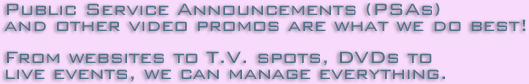 From direct selling company promo movies to 30 second PSAs for non profit organizations, we can manage any project from start to finish.