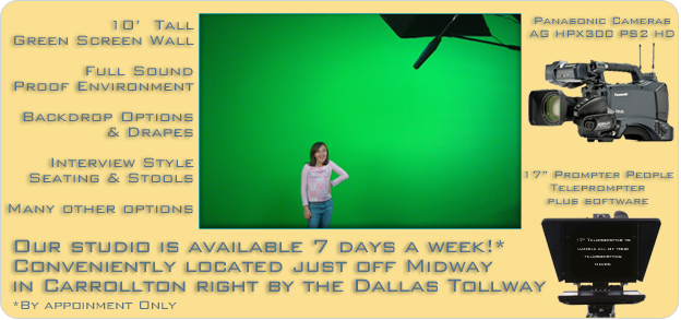If you're on a budget, you'll find we're the best deal in town, bar none. Whether you need a place to film a quick Internet video clip or full video commercial, our studio can accomodate your every need.